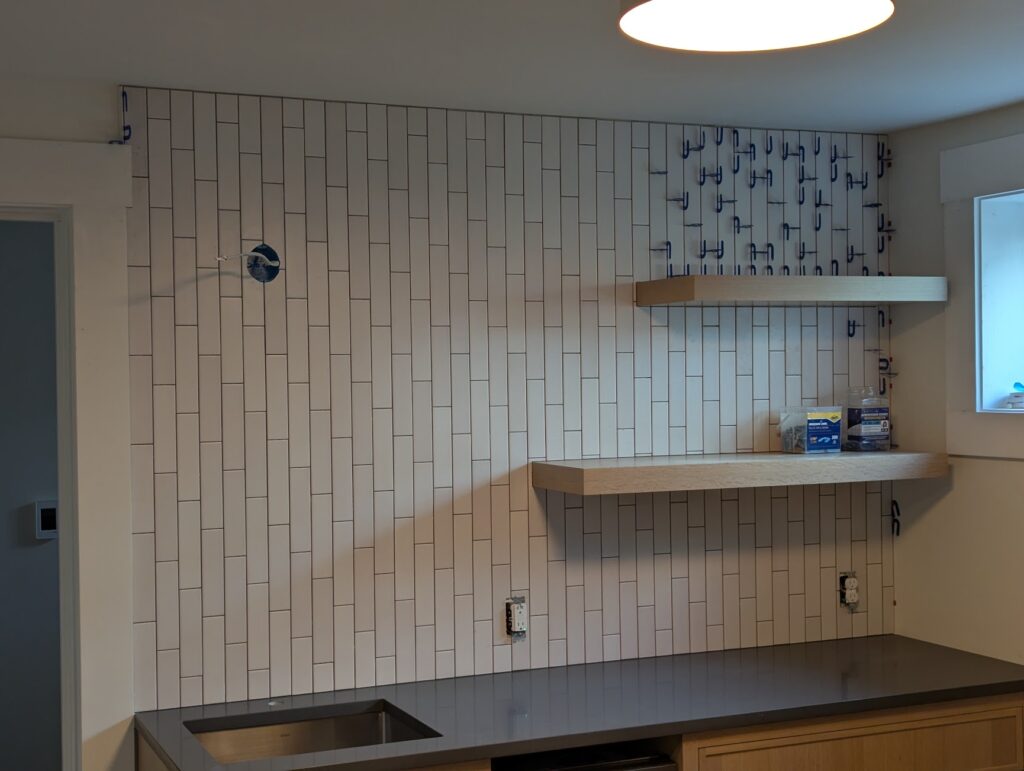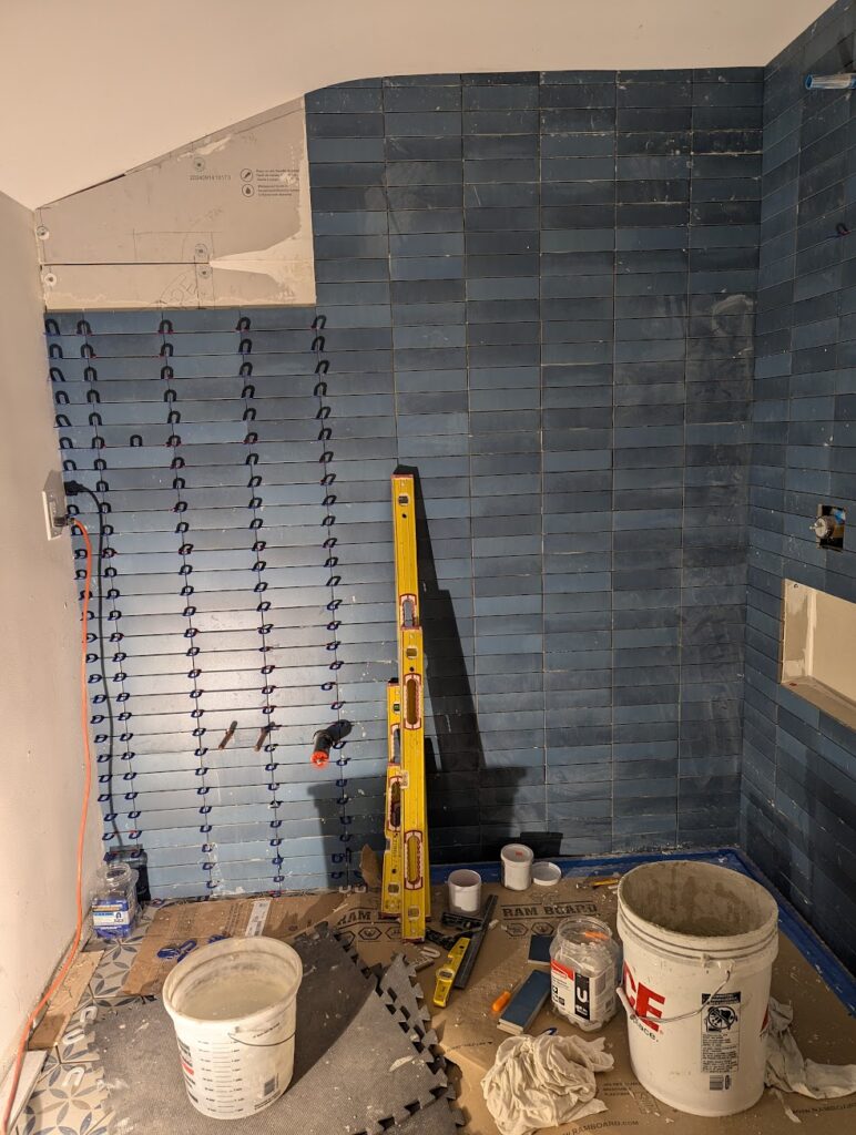 I’m not going to belabor this, just a quick note about how the work you do before you put all the pretty stuff on top is at least as important as the pretty stuff. I agreed to do a tile job for a friend that has a remodeling company. Because I’d worked with him in the past and consider him a quality carpenter that knows how to do things, I assumed that the prep work would be up to par and I’d just be doing tile. I was wrong, The walls were neither plumb nor flat, and the floor wasn’t level or flat. Those characteristics are non-negotiable. I had to spend days tearing apart the back wall to get it ready for tile, and because the floor was already set up for radiant heat, I was just going to have to deal with it the way it was, which I hate doing because now instead of laying the tile on a flat surface, I had to use varying amounts of thinset mortar to produce a flat surface. You don’t know how unpleasant that is until you’ve done it.