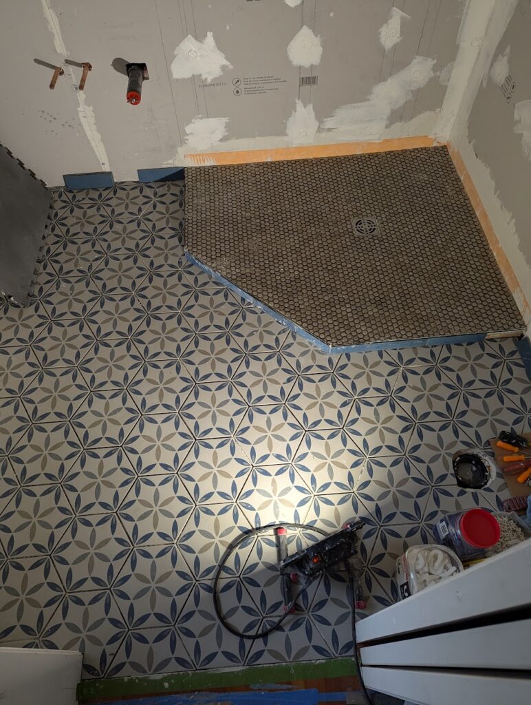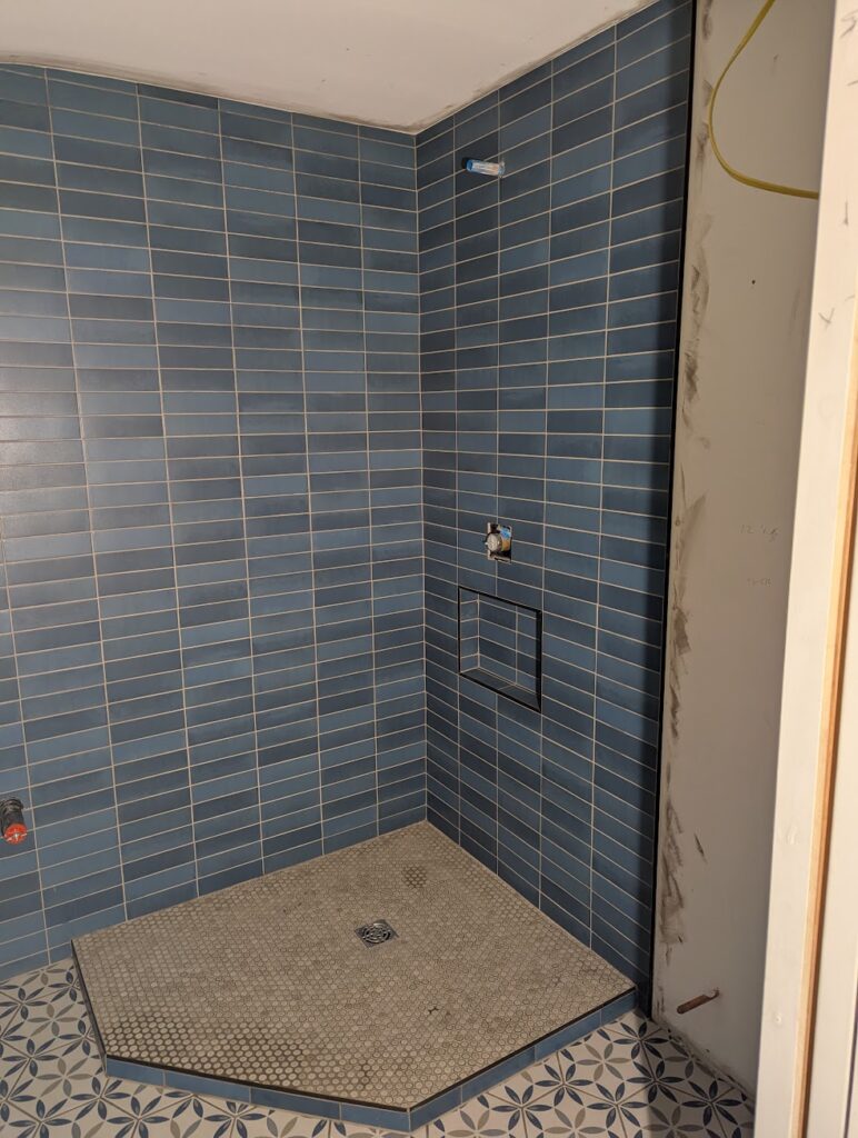 When I remodel a bathroom, or any surface that is going to be tiled, the first order of business is to get everything plumb, level and flat. It’s not optional, it’s just the way it’s done. Whatever time you take to ensure that will be more than recouped in the time saved when it comes time to tile. Why is this so important? For floor tile, a flat floor allows you to pick the appropriate trowel size for the tile your installing, spread a consistent amount of thinset mortar over the surface, and then simply lay the tile out with the desired grout line. You don’t have to worry about one tile being higher or lower than any other, which creates a lip which is undesirable. You don’t have to constantly gauge how much mortar is under individual tiles because it’s the same amount for each tile. This was even more complicated by the fact that this was hexagonal tile. It makes it quicker, funner, and a better product.