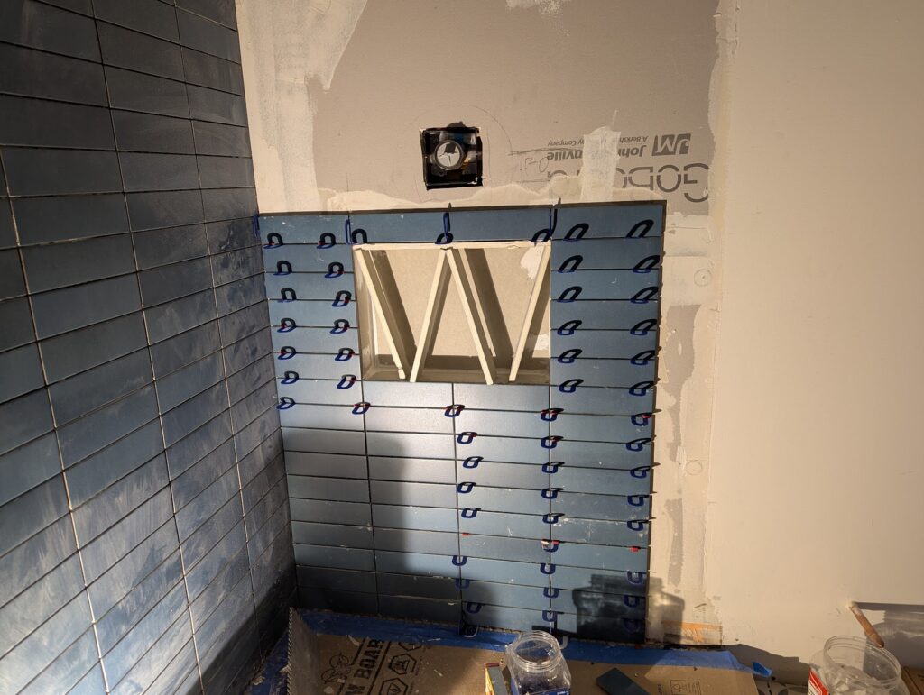 Another quick note about the wall prep. Backer board traditionally comes in 3’x5′ sheets, like Hardi Backer or Durarock. I don’t use either of those products anymore because they are hard and messy to work with, they’re heavy, and they are not waterproof, requiring a liquid membrane to become waterproof. I long ago switched to various foam backer boards because they are light, can be cut with a utility knife, and are waterproof, and come in 4’x8′ sheets. The board this guy used is called Go Board, which I’be used before and quite like, but he used the 3’x5′ sheets, which I try to never use. Even if you get your framing plumb and flat, you’re still creating a circumstance where a hinge point can occur, and a subtle change of plane can happen. Minimizing this will save you time, and you’ll have less seems to waterproof. This was exacerbated in this instance because in addition to to the smaller sheets, he also didn’t stagger the seems, so that before I fixed it, the whole left side dipped in rather dramatically, which causes a problem because tile doesn’t bend.