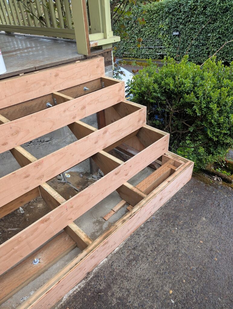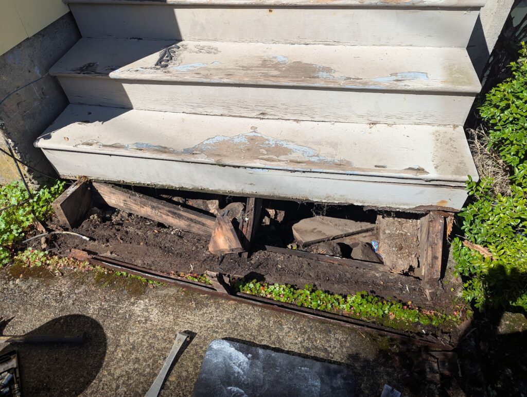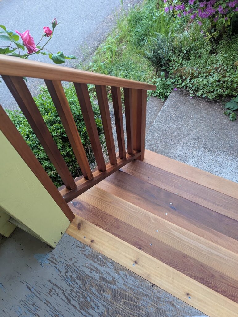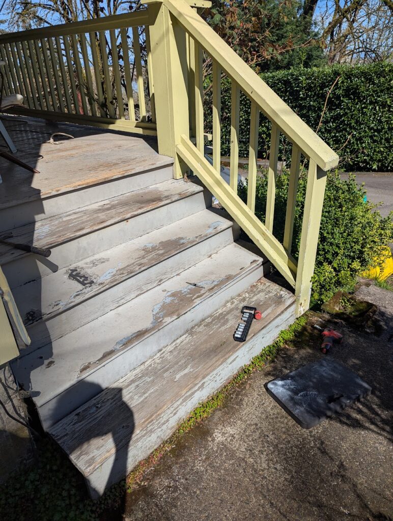 The commute to this job was really convenient as it was at my house. The porch stairs at my house had been falling apart basically ever since I moved in so I contacted my landlord and asked him if he wanted me to rebuild them, and he did. I was looking forward to this project because I could make it exactly as I wanted to without too much consideration as to how long it would take. There were few things I wanted to try that I might be hesitant to do for a client because I didn’t know how long it would take or how well it would hold up over time, so this seemed like a great opportunity to do some experimenting and then I could monitor how well it would wear.