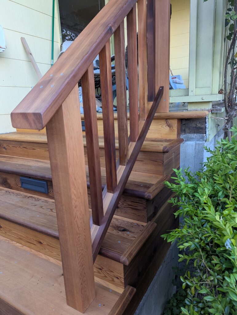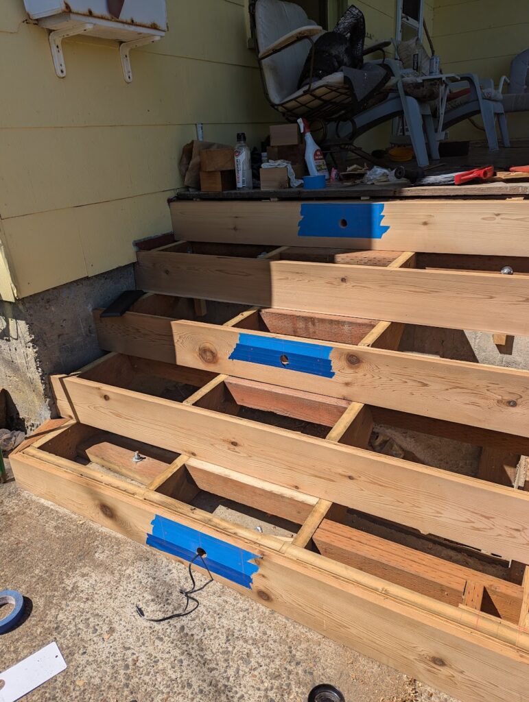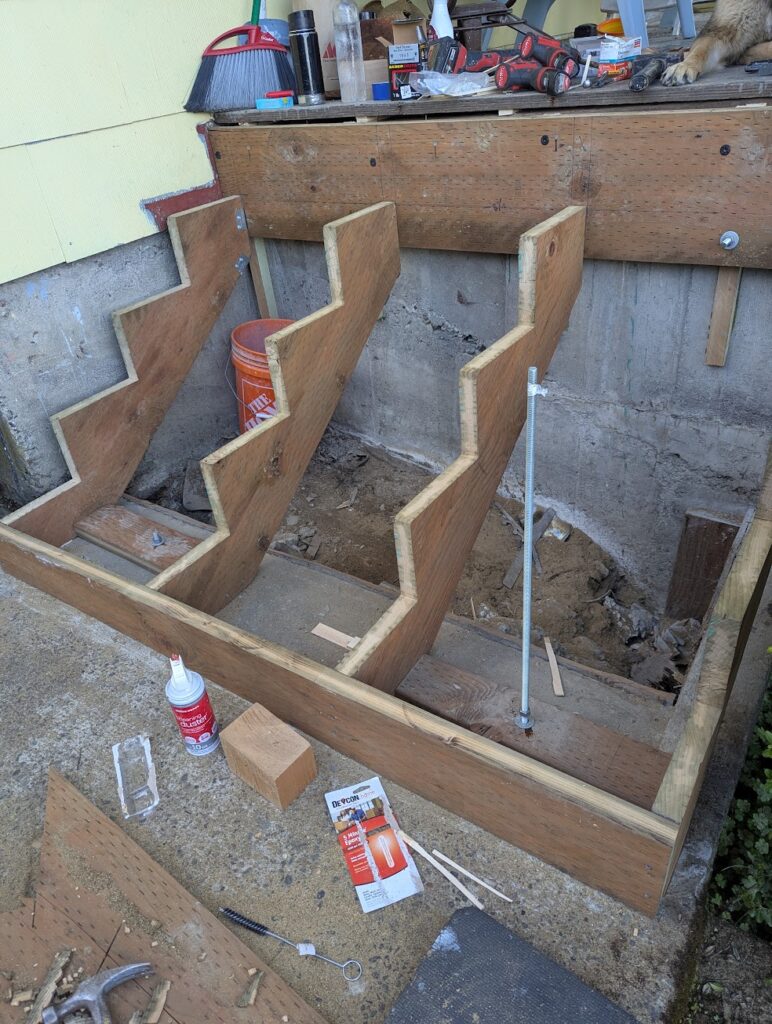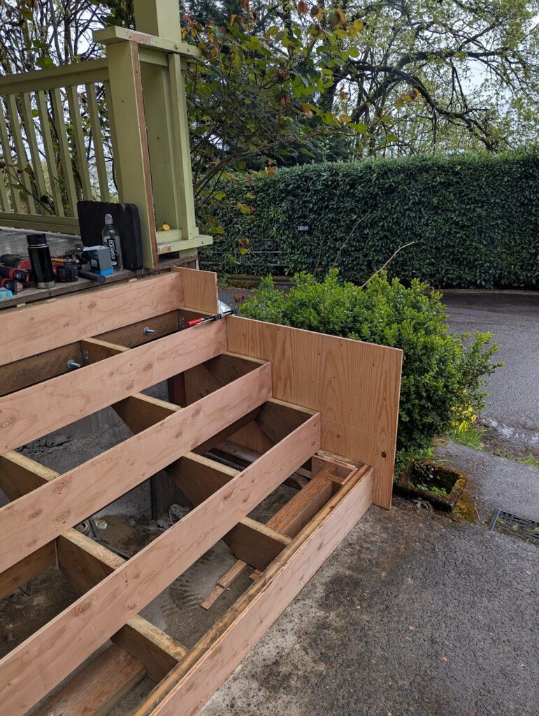 The commute to this job was really convenient as it was at my house. The porch stairs at my house had been falling apart basically ever since I moved in so I contacted my landlord and asked him if he wanted me to rebuild them, and he did. I was looking forward to this project because I could make it exactly as I wanted to without too much consideration as to how long it would take. There were few things I wanted to try that I might be hesitant to do for a client because I didn’t know how long it would take or how well it would hold up over time, so this seemed like a great opportunity to do some experimenting and then I could monitor how well it would wear.