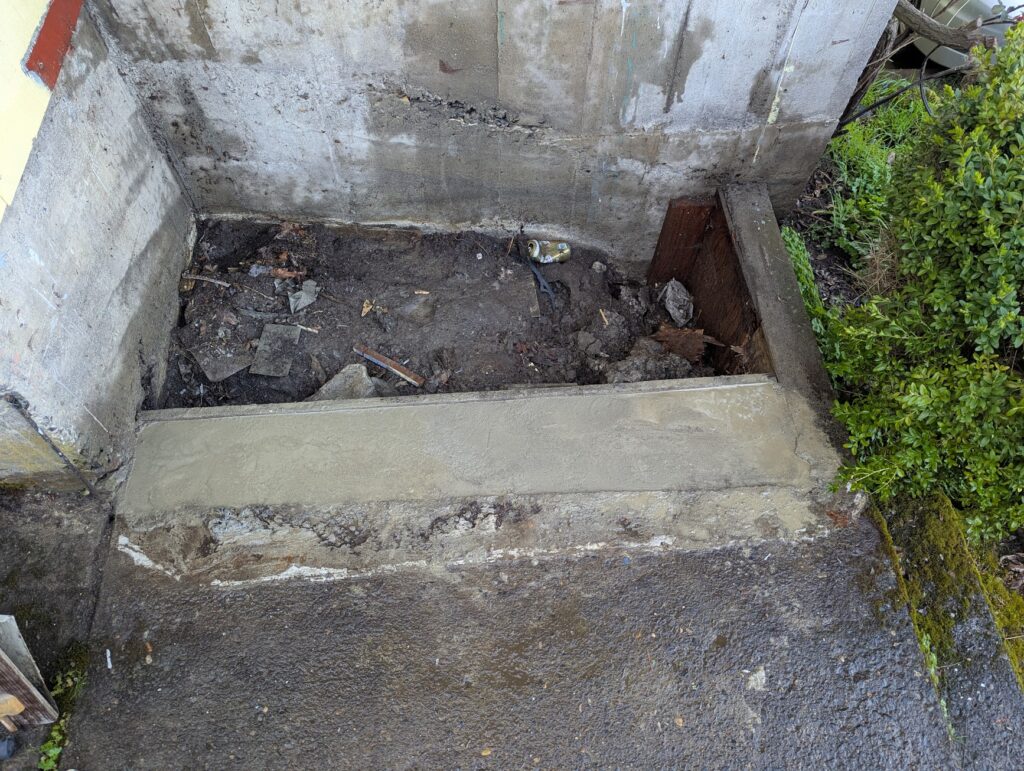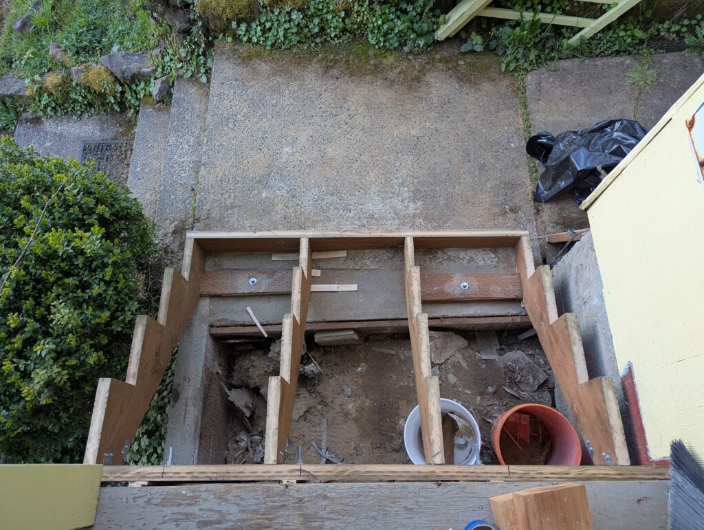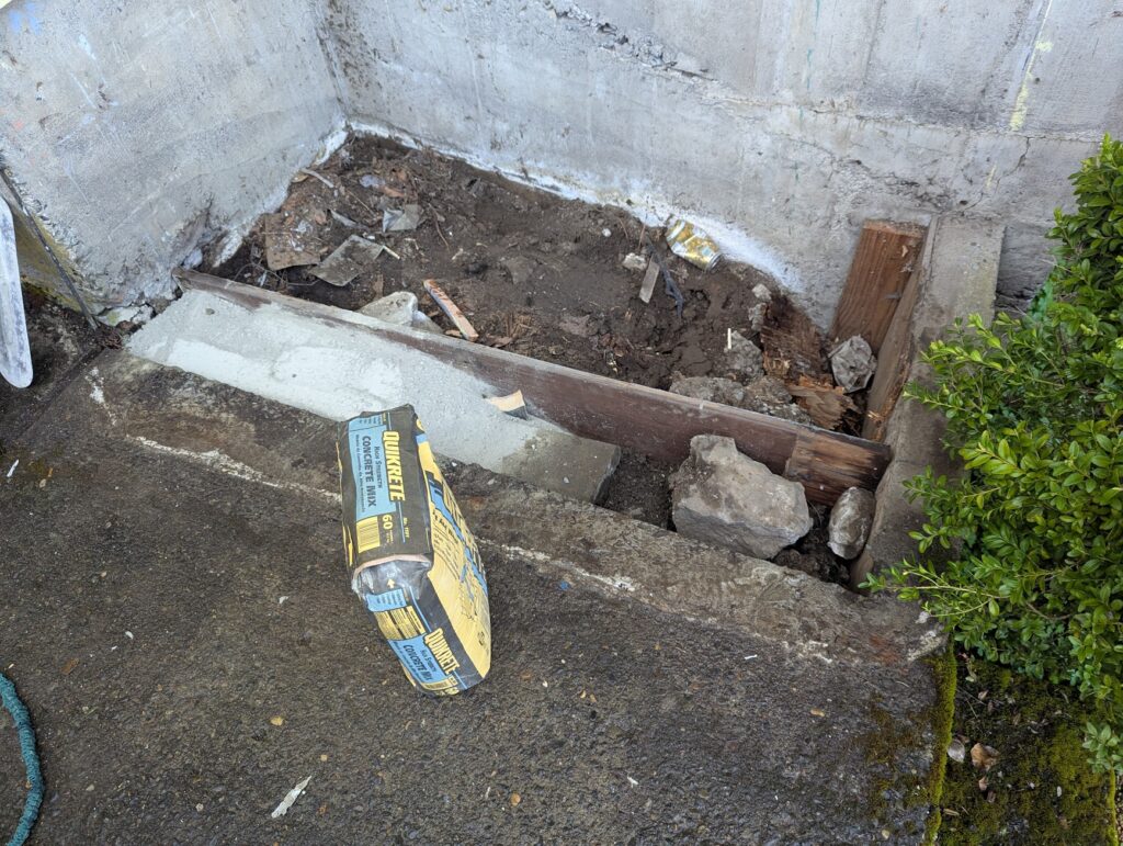 After demoing the old stairs, the first thing that I realized was that only a few inches of the stringers would make contact with the cement sidewalk that they would need to sit on, so I made a pretty crude form that I filled with as many rocks and cement chunks as I could find so that I didn’t need to go crazy with the cement.