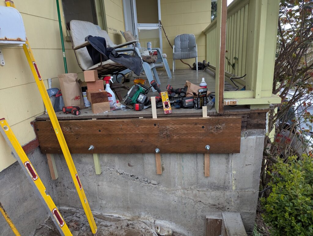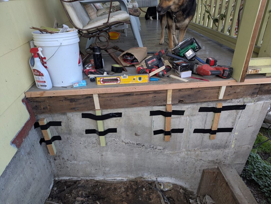 Next, I had to fur out the wall that I would be attaching the ledger board to so that it was square to the house, which it wasn’t. I held the furring strips in place with epoxy and then drilled through them and the cement wall behind them and epoxied threaded rod into the wall to attach the ledger board.