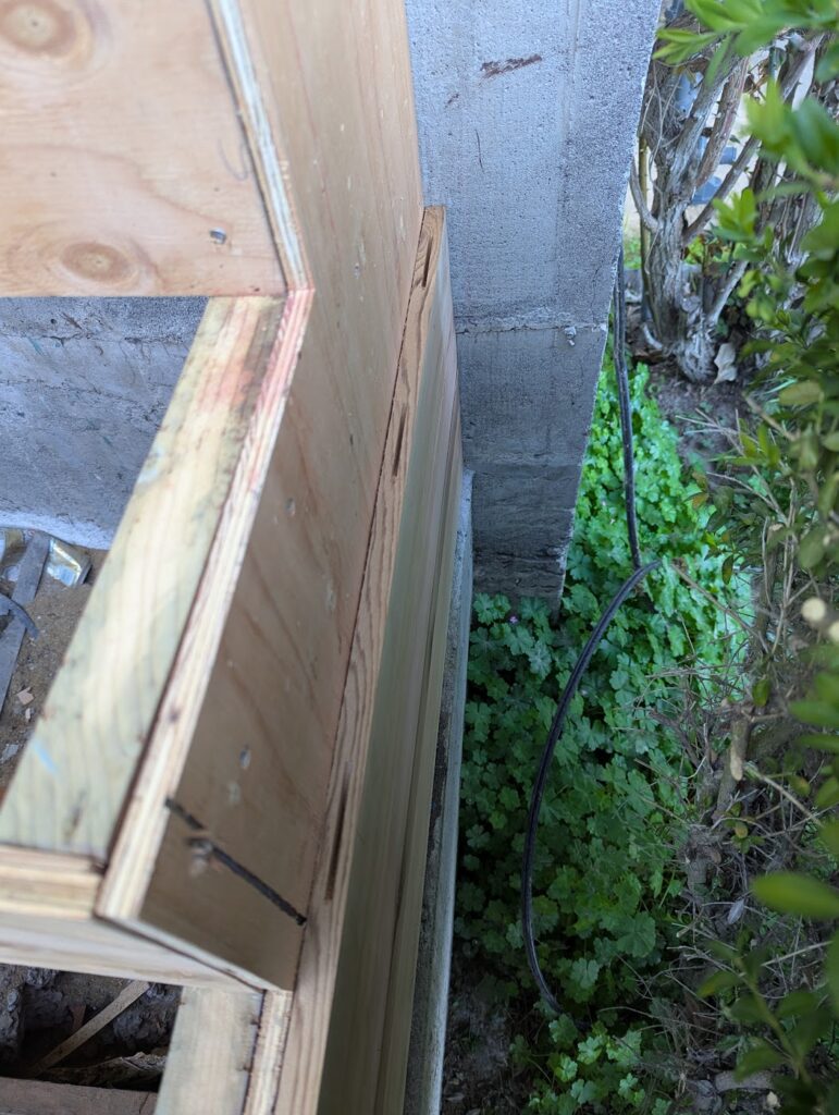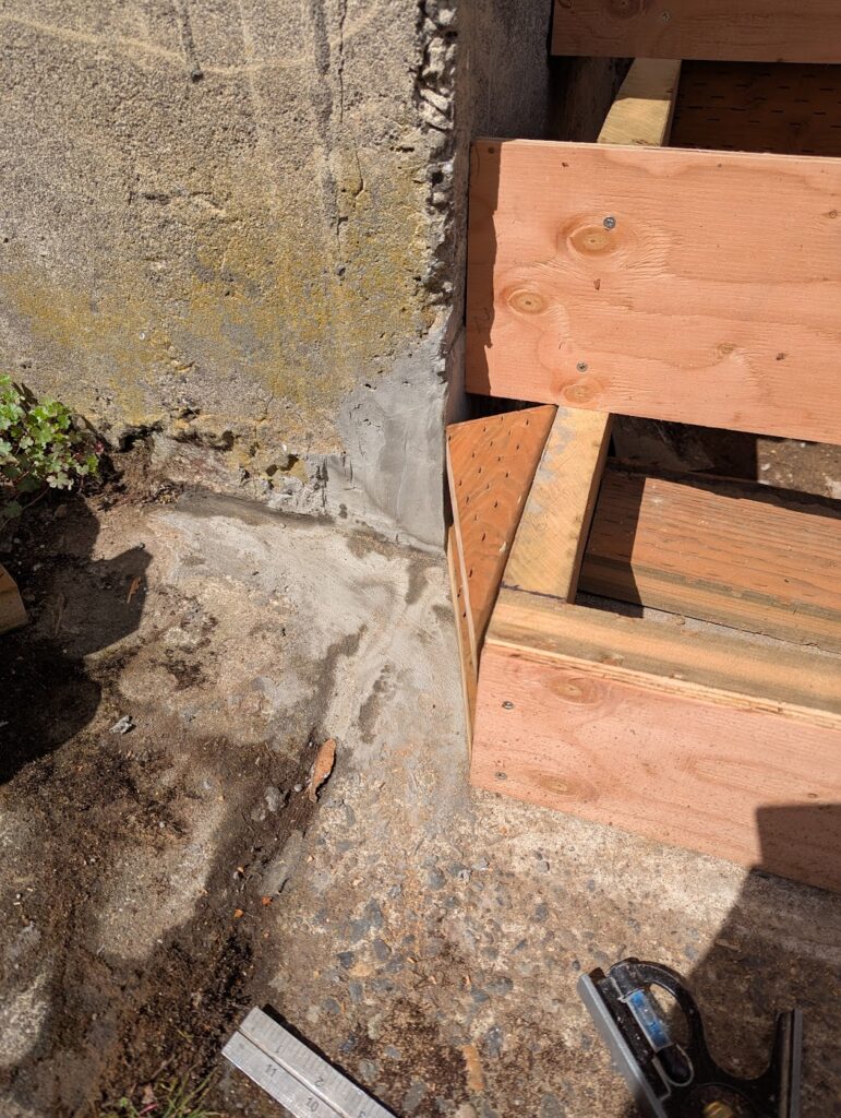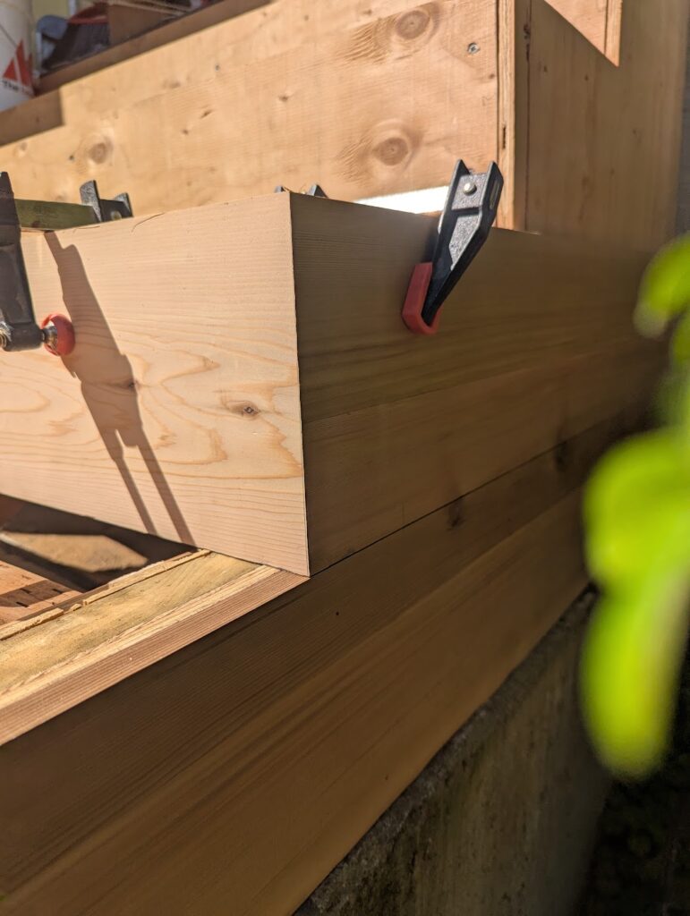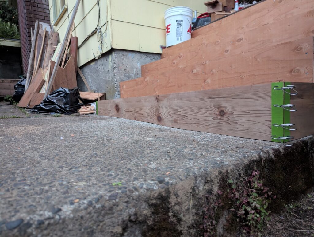 The two things that I wanted to do that I was unsure was actually a good idea was I was going to clad the thing in 1×6 cedar with mitered corners, and I was going to make my own treads by gluing up 2×6 (which was a mistake, I should have gone with 2×8 because I later had to add another couple of inches to them to make them deep enough). Exterior miters, like if you’re wrapping a post, usually don’t hold great, but I thought maybe if I epoxied them I might have better luck. Esthetically, it’s what I wanted it to look like, wrapping around from the riser into the side. First, I did some framing to create a void where the newel post would slot into, then a little patch on the foundation with some hydraulic cement, and then I clad all the vertical surfaces in 1/2″ plywood, to which I would be attaching the “siding” and risers with stainless steel 18g brad nails and construction adhesive. If you’re doing a project like this, made of cedar and exposed to the elements, all you’re fasteners need to be stainless steel because if not they will rust and they will stain the wood.