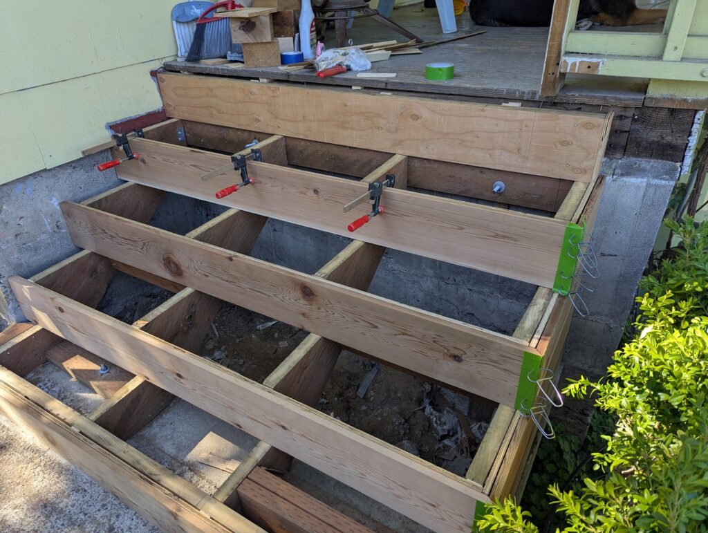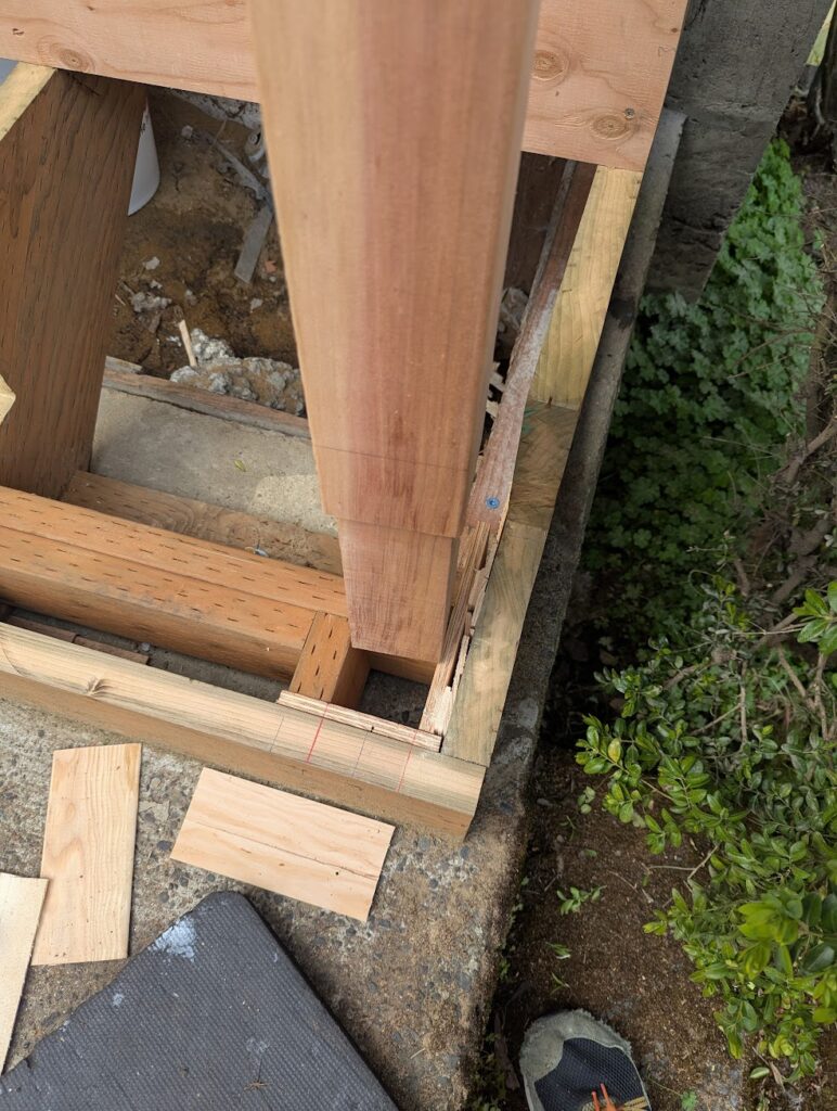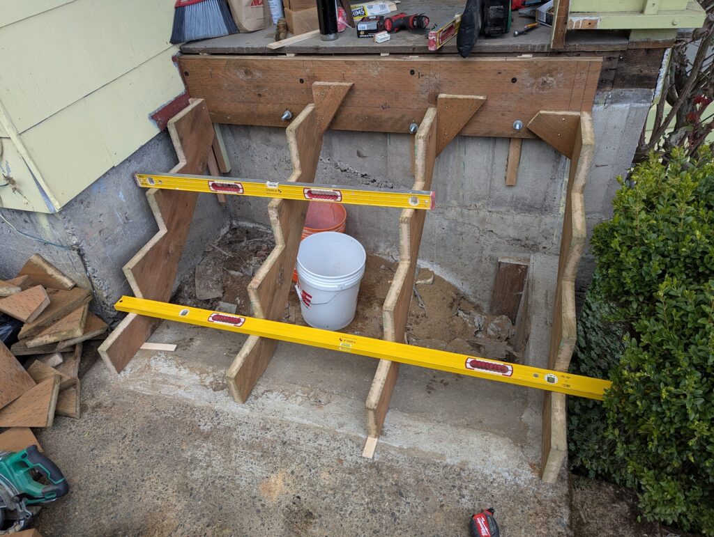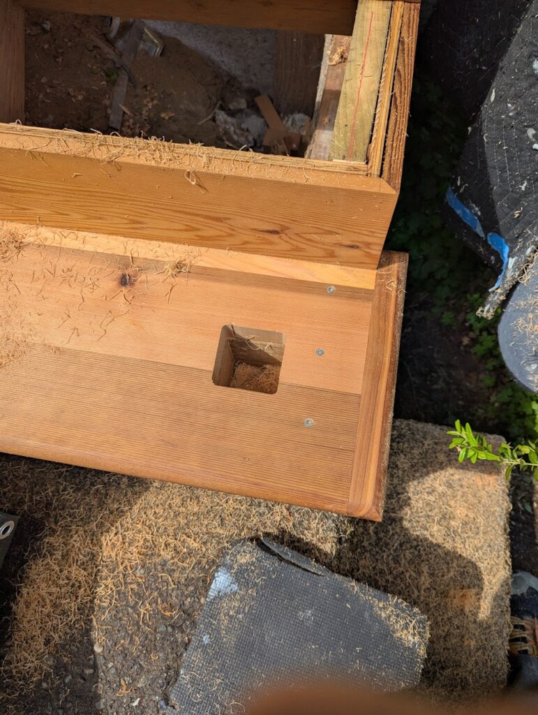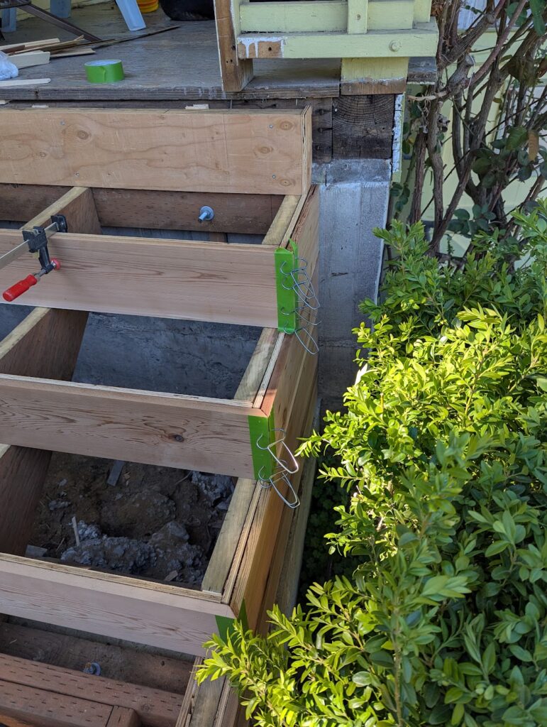 The two things that I wanted to do that I was unsure was actually a good idea was I was going to clad the thing in 1×6 cedar with mitered corners, and I was going to make my own treads by gluing up 2×6 (which was a mistake, I should have gone with 2×8 because I later had to add another couple of inches to them to make them deep enough). Exterior miters, like if you’re wrapping a post, usually don’t hold great, but I thought maybe if I epoxied them I might have better luck. Esthetically, it’s what I wanted it to look like, wrapping around from the riser into the side. First, I did some framing to create a void where the newel post would slot into, then a little patch on the foundation with some hydraulic cement, and then I clad all the vertical surfaces in 1/2″ plywood, to which I would be attaching the “siding” and risers with stainless steel 18g brad nails and construction adhesive. If you’re doing a project like this, made of cedar and exposed to the elements, all you’re fasteners need to be stainless steel because if not they will rust and they will stain the wood.