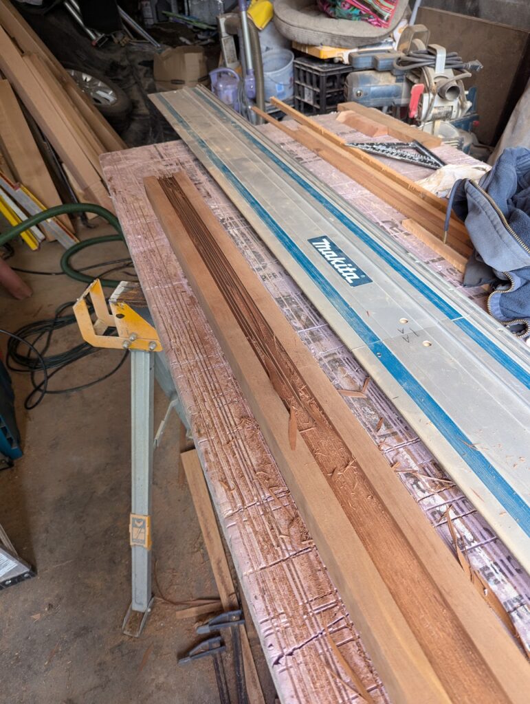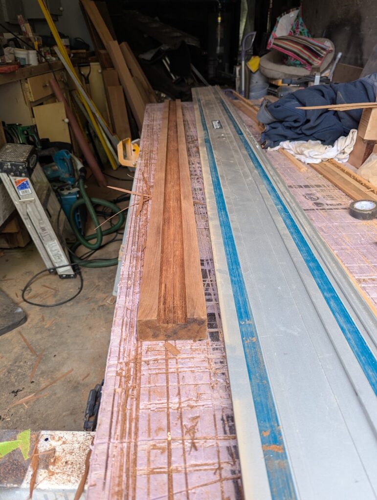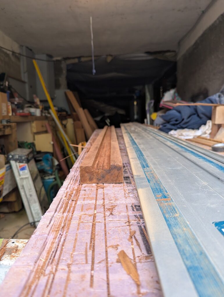 The final “experimental” aspect of these stairs is that I wanted the handrail to be built with a plow and fillets where the pickets are built into the railing, as opposed to the much more common technique of attaching a 2×2″ to the top and bottom rail and affixing the pickets to that. The way I wanted to do it is common in interior applications, but in those circumstances the parts are all milled for that purpose, whereas I had to make my own, and the 2×2″ I was using is milled less accurately than it would be for interior use. If I had a wood shop full of all the tools, this wouldn’t have been a very big deal, but I don’t, so there was some improvisation necessary. I cut the plow with my track saw, making a cut every 1/16′” or so, and then cleaning out what was left with a chisel. Not the most efficient way to do this, and I basically had to sand down each picket to size.