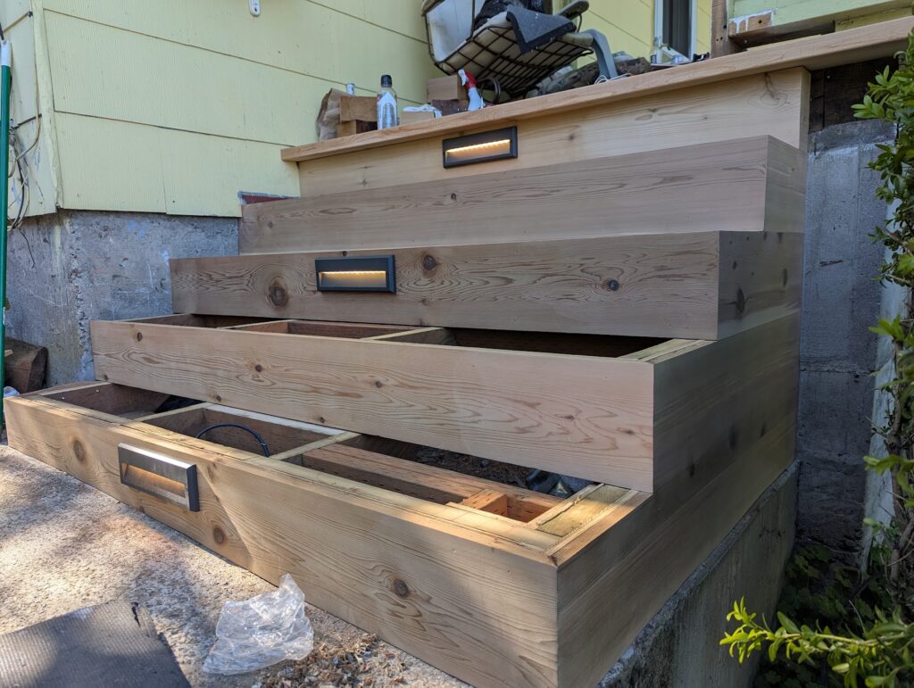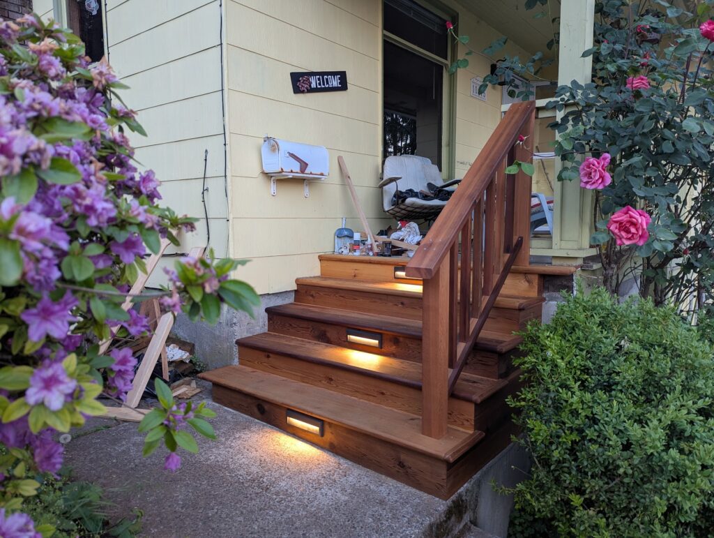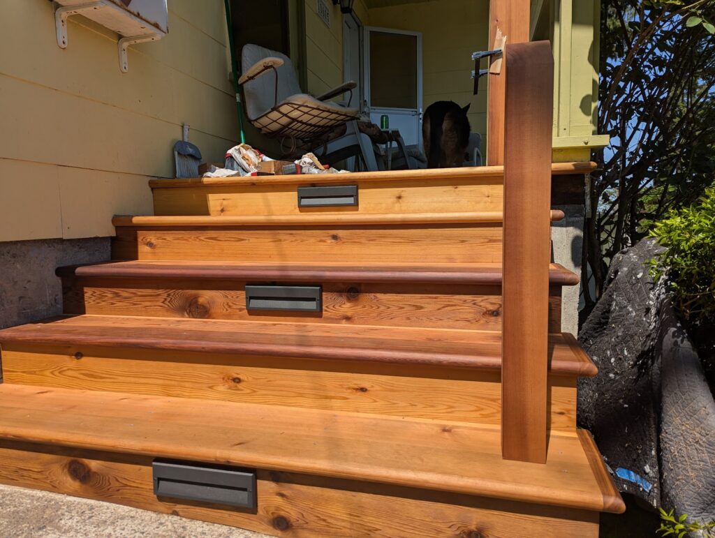 And that’s about it! Like I said, I would absolutely have gone with one light per tread, and now, many months later, I can say that the stain has not held up to what I would have expected. Did I not mix it good enough? Does it just suck? Is having your cedar exterior stuff consistently look good just constant maintenance? Not sure. I’m going to re-stain it soon and see how it does through the winter. Other than that, I’m very happy with how it turned out and wouldn’t really change anything else.