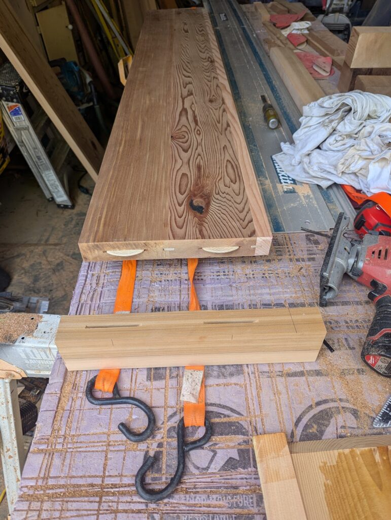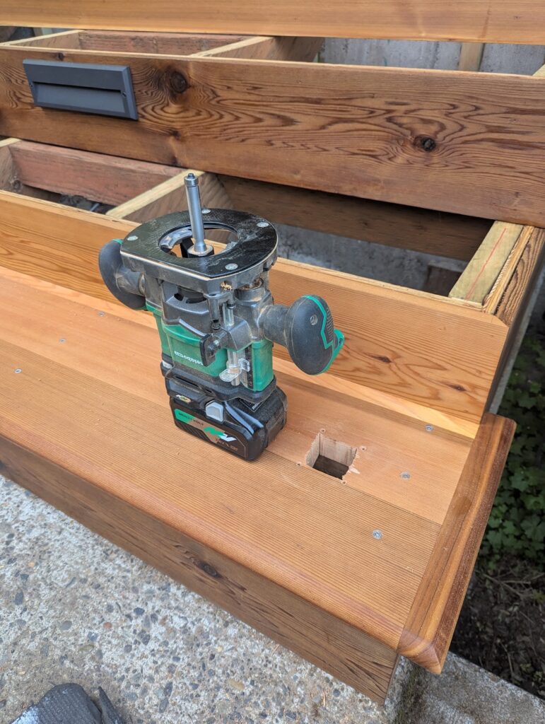 As I mentioned, I was making my own treads for this. I initially used 2×6 because that would in theory be 11″ wide, but after planing the edges to make them flat enough for glue up, I lost enough depth that I ended up adding another 1 1/2″ to each tread. I was also concerned about the exposed end grain and wanted the treads to integrate into the body of the thing in an elegant way, so I ended up adding an 1 1/2″ piece to the end of each tread. I then routed a bullnose around the whole thing with a truly sketchy 3/4′” radius bit that barely fit in my router, like there was less than a 1/16′” gap between the bit and the router base plate. This is another thing I wonder if it will hold up. This is where having a Festool Domino instead of just a biscuit joiner would be really helpful. I pre-stained them before installation.