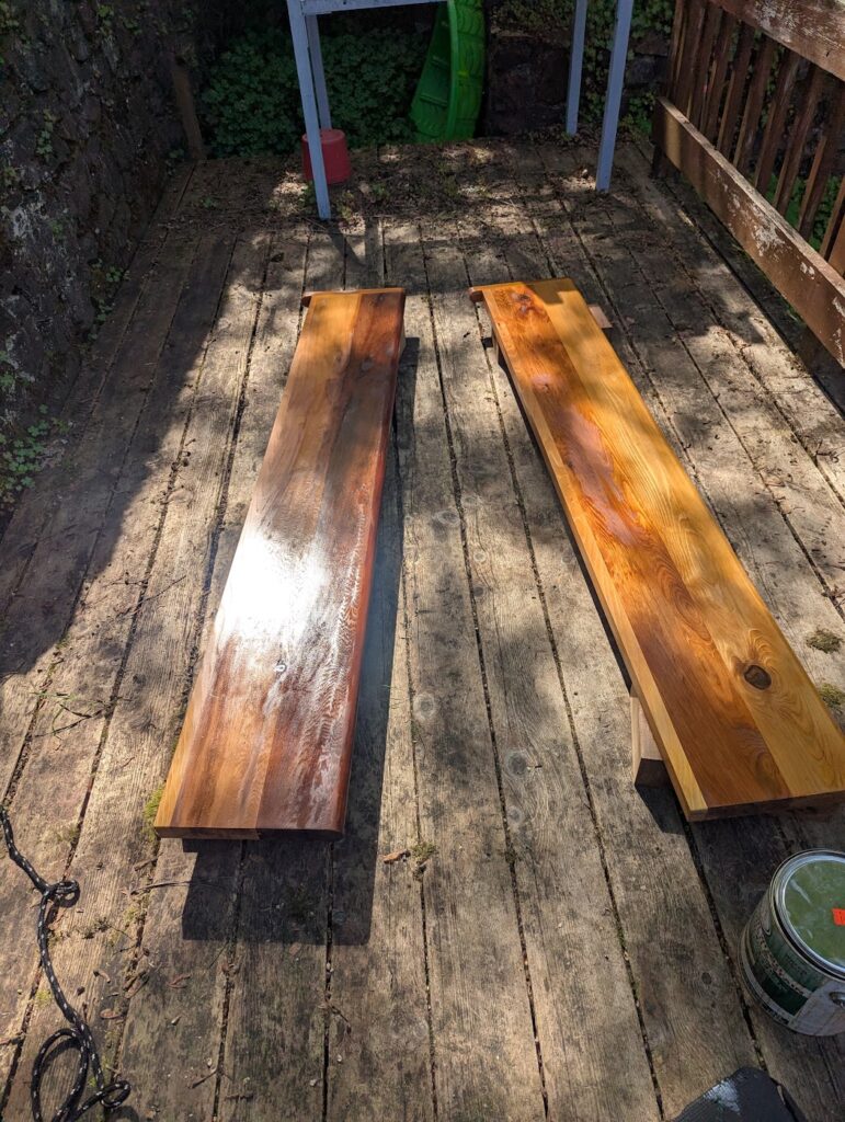 Once everything was cut to size and installed, I filled some knot holes with something called CA glue, basically super glue, rounded over the exterior edges a little, sanded everything down, put some end-grain goo on the ends to deter splitting and applied some Sun Frog cedar tone stain/finish to it.
