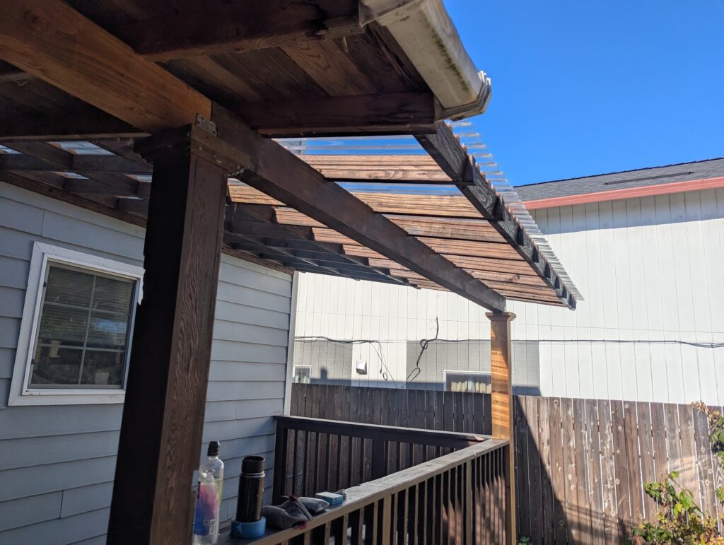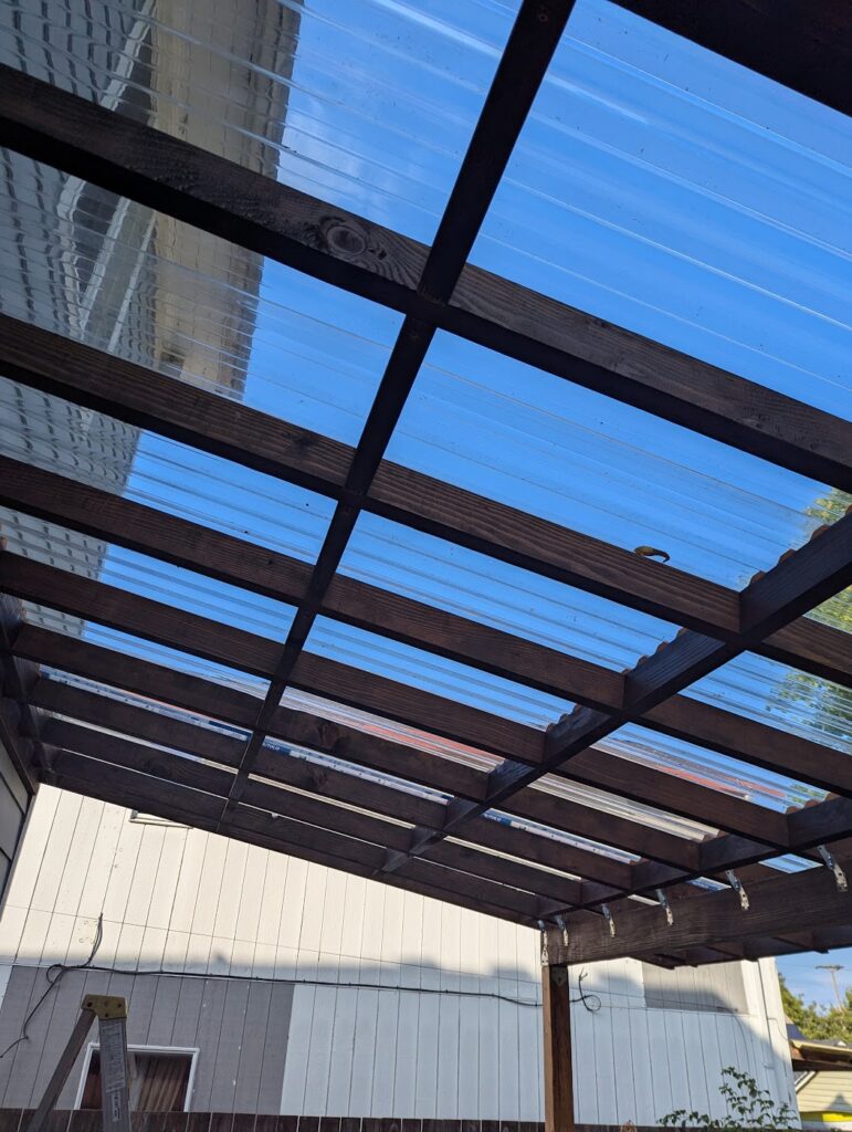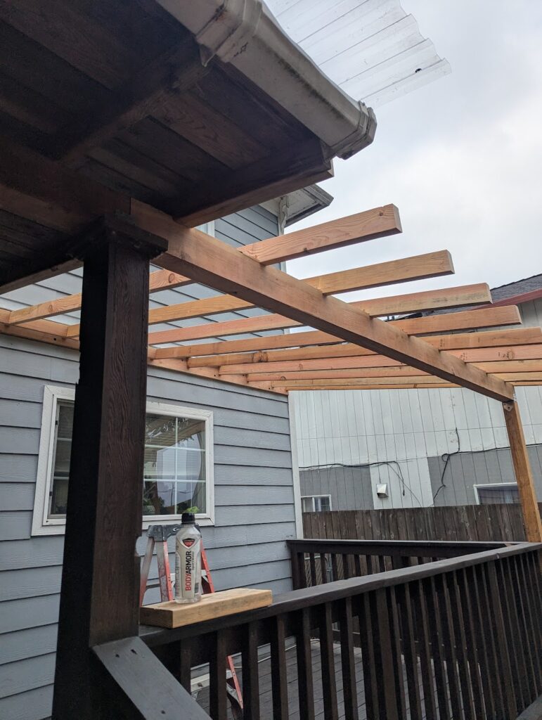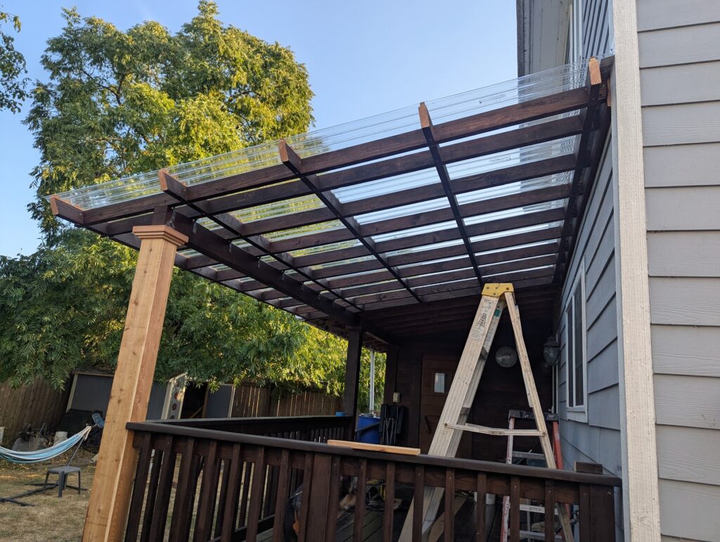 This was a quick little project that I did for a friend of mine. He wanted to extend a roof over his pack deck, but do it in transparent panels so it would still get sun. I was kind of constrained by having to match the existing roof, which was fine, but also I don’t think using 2×4’s for ceiling joists is ideal. If I was just doing the whole thing from scratch, I’d use at least 2×6, but also I don’t think it’s a big deal. The biggest problem wasn’t so much that I don’t think they’re strong enough, but that it’s basically impossible to find a straight 12′ long 2×4. If I was trying to do this really cool (and money was concern, because in this case it was), I think I’d look into what kind of engineered product would be appropriate for an exposed exterior application, but this is just made out normal framing material. I didn’t take as many pictures as usual, but this is also a lot more straight forward than what I usually do, so this will be a pretty quick entry.