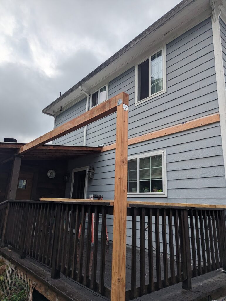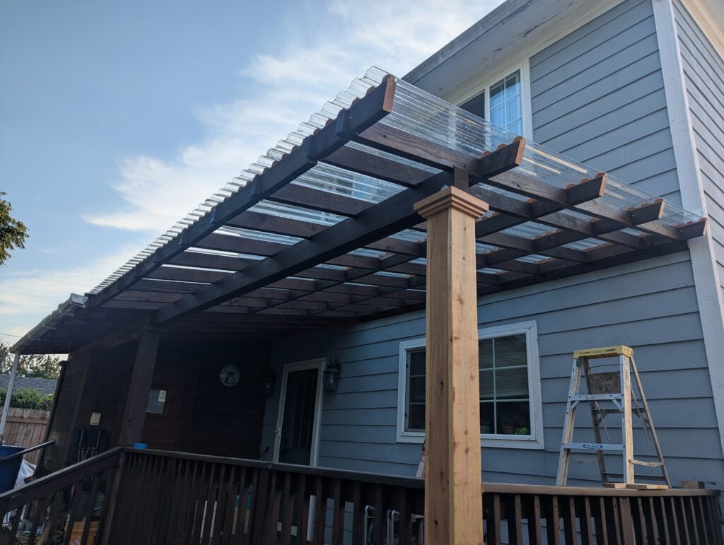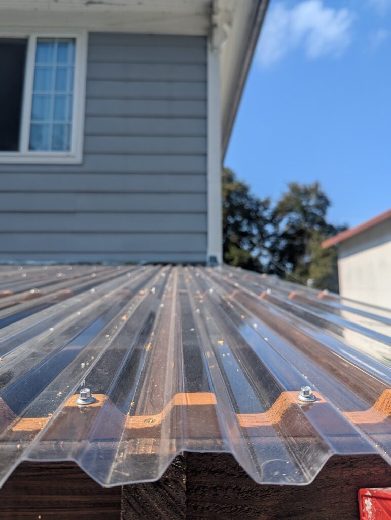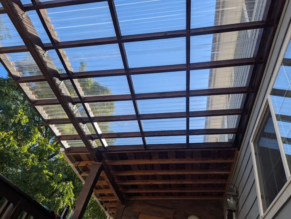 This was a quick little project that I did for a friend of mine. He wanted to extend a roof over his pack deck, but do it in transparent panels so it would still get sun. I was kind of constrained by having to match the existing roof, which was fine, but also I don’t think using 2×4’s for ceiling joists is ideal. If I was just doing the whole thing from scratch, I’d use at least 2×6, but also I don’t think it’s a big deal. The biggest problem wasn’t so much that I don’t think they’re strong enough, but that it’s basically impossible to find a straight 12′ long 2×4. If I was trying to do this really cool (and money was concern, because in this case it was), I think I’d look into what kind of engineered product would be appropriate for an exposed exterior application, but this is just made out normal framing material. I didn’t take as many pictures as usual, but this is also a lot more straight forward than what I usually do, so this will be a pretty quick entry.
