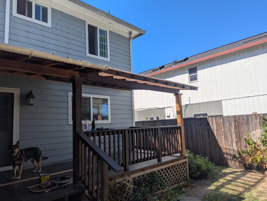 With the roof attached, and a little bit of monkeying around to flash the corner, I wrapped the posts, ripped some pieces to mimic the column trim of the existing post, and reattached the hand railing. My friend was stoked, and I thought it turned out nice as well. As a bonus, every day was bring your dog to work day, and there were about a thousand insane squirrels around to keep her company.